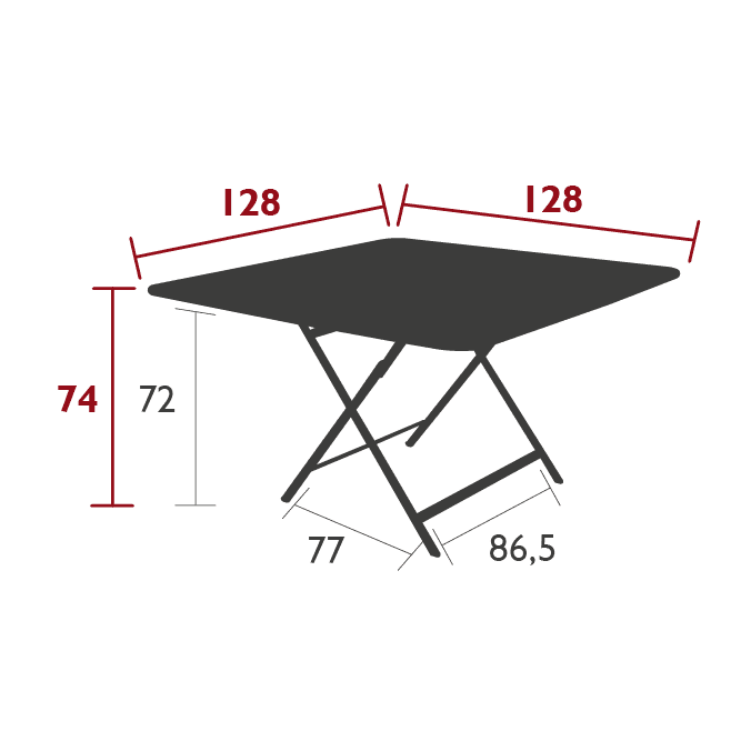 128 x 128 x H73cm Höhe Unterkante Tischplatte: 72cm Struktur: Stahlrohr mit länglichem Profil Tischplatte: Stahlblech Aluminium-Verstrebung als Verstärkung unter der Tischplatte. Verbesserte Mechanik (verbesserte horizontale Ausrichtung) - Privatgebrauch - beruflichen Gebrauch/Horeca - nicht für öffentlichen GebrauchMaße Gewicht 27,0 kg Material Farbe Die Tische Caractere sind in 25 Farben erhältlich* Beschichtung UV resistente Polyester-Pulverbeschichtung** Anti Korrosionsindex 8IPAC Allgemein Klappbar, mit Gleitern. Garantie 2 Jahre Alterungsgarantie, 5 Jahre Funktionsgarantie*** Geeignet für