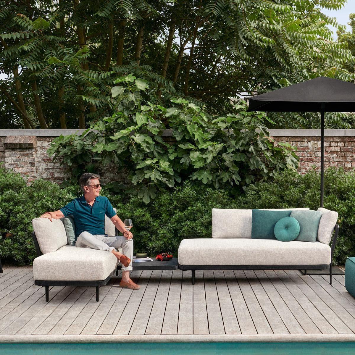 Das Loungekonzept 3 FLOWS besteht aus einem offenen Endelement, einem geschlossenen Endelement, einem mittelgroßen Tischelement und einem kleinen Endtischelement. Die Flexibilität des modularen Systems ermöglicht es Ihnen, die Anordnung jederzeit nach Ihren Wünschen anzupassen und durch weitere Möbelstücke der Flex-Kollektion zu ergänzen. Genießen Sie die warmen Tage in einer Umgebung, die durch luxuriöses Design und erstklassige Materialien besticht.