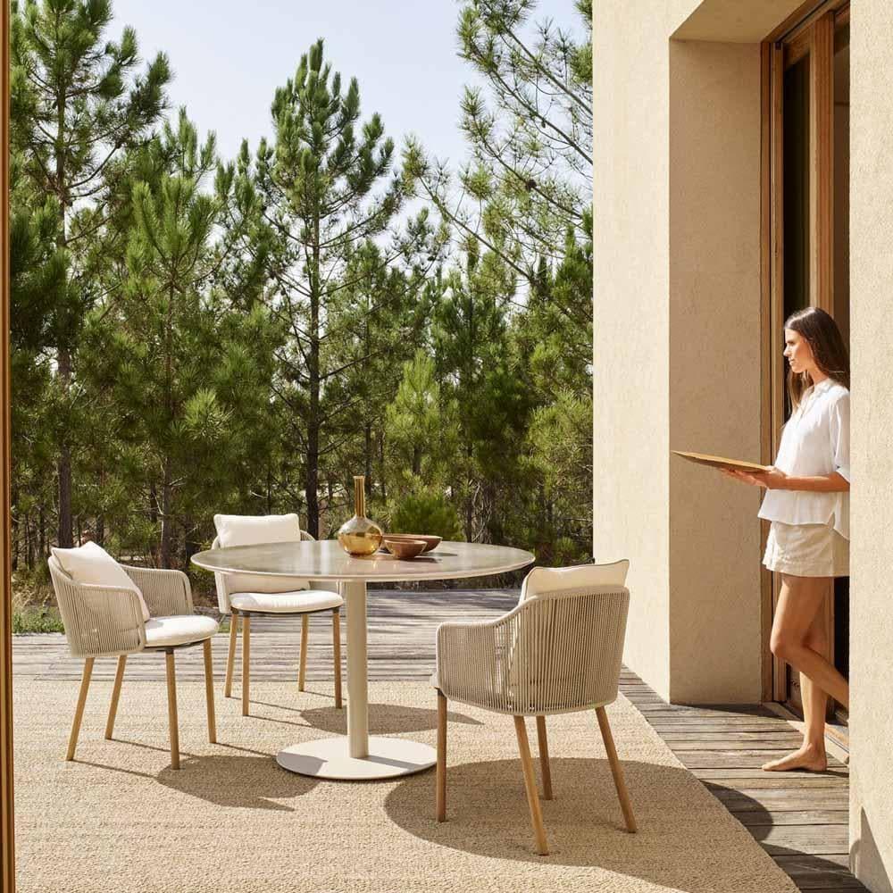 Die leicht geschwungene Rückenlehne des SENJA Armlehnstuhls passt sich perfekt der natürlichen Form des Körpers an und sorgt so für ein unvergleichliches Sitzerlebnis. Jedes Detail, von den präzise gefertigten Armlehnen bis hin zu den stabilen Füßen, die wahlweise aus Aluminium oder Teakholz gefertigt sind, wurde mit größter Sorgfalt entworfen, um ein Höchstmaß an Komfort und Langlebigkeit zu gewährleisten.