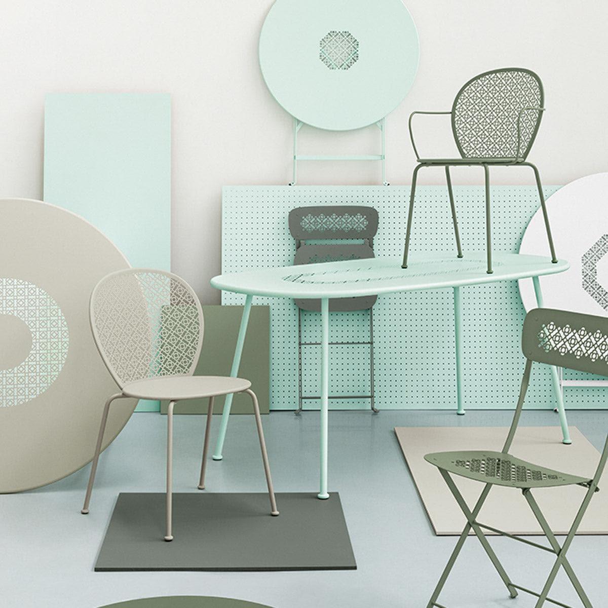 An oval table at Fermob? This is brand new! The design of the designer Frédéric Sofia with its inviting and generous form was realized for this premiere. Ideal for limited space on the terrace: 6 guests can meet, talk and have fun with a feast outdoors. But even if the shape is its originality, it rises oval table Lorette But also due to its punched -out metal table top. The artistic perforation, which is the focus of this collection, gives it an incredibly chic appearance: the motif is visible even when the table is covered. Lorette enchants townspeople who long for nature with its rural charm. The feet are so shaped that they do not sink in the lawn, so that Lorette also takes a good picture away from the terrace.