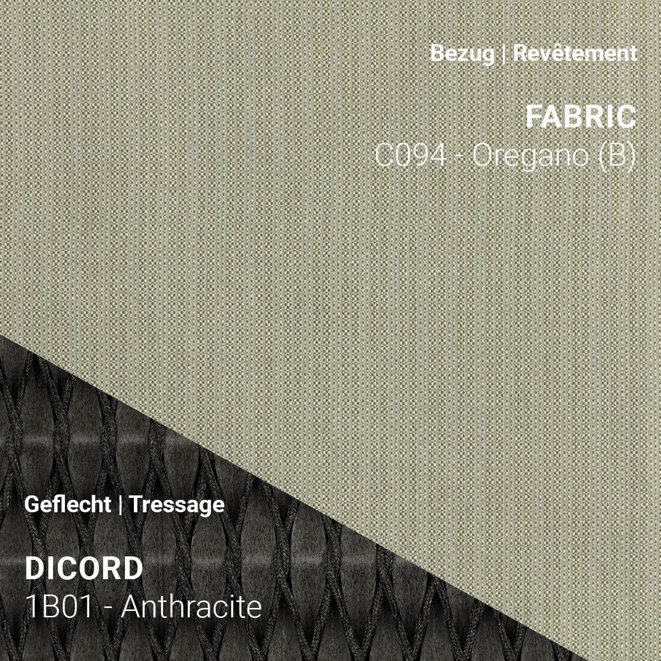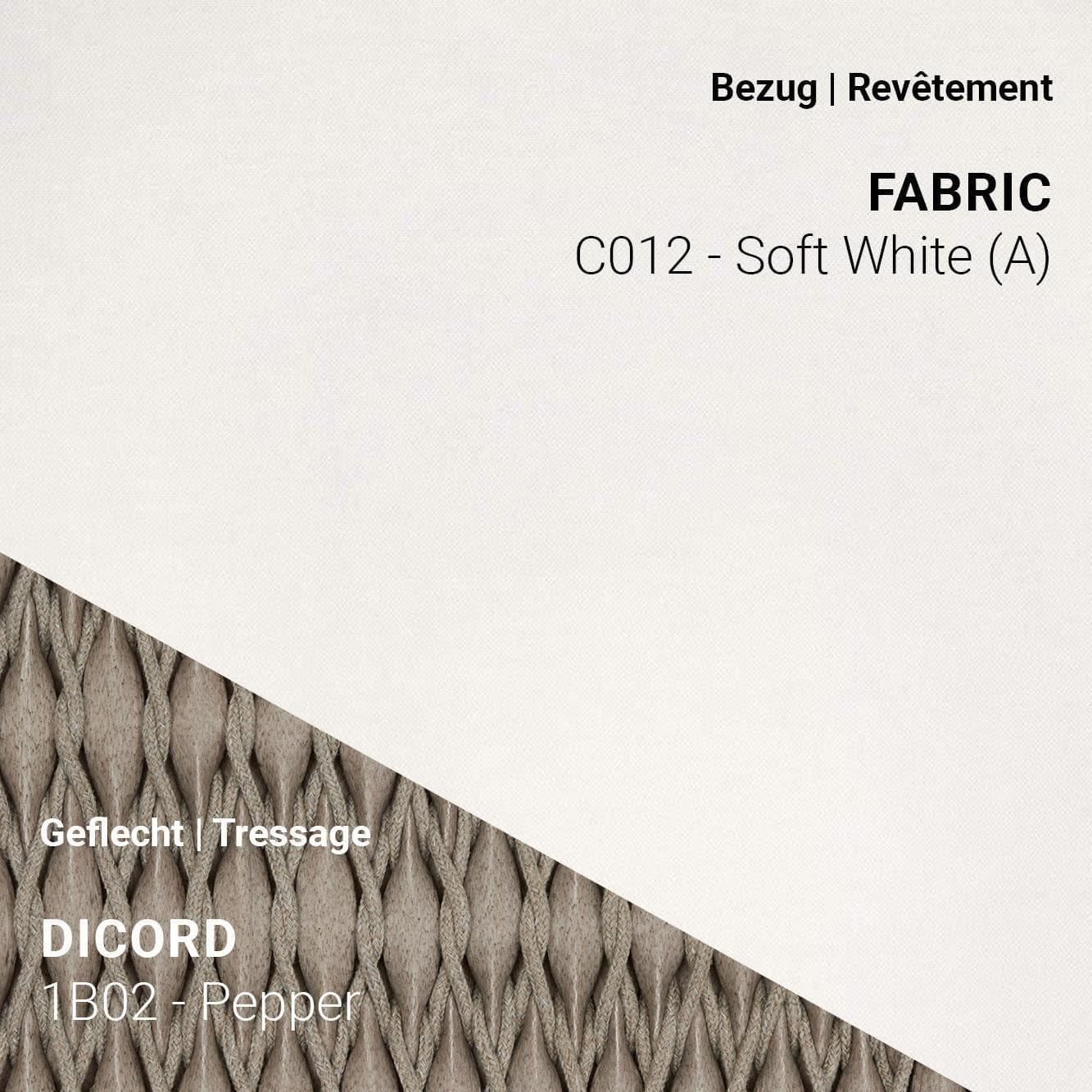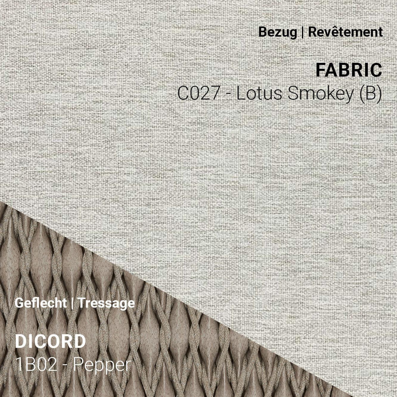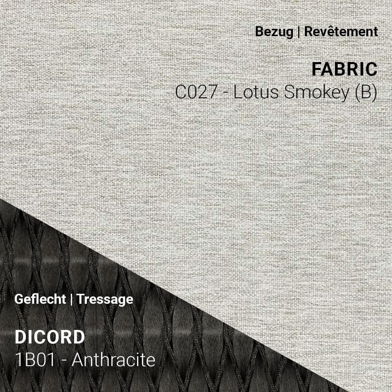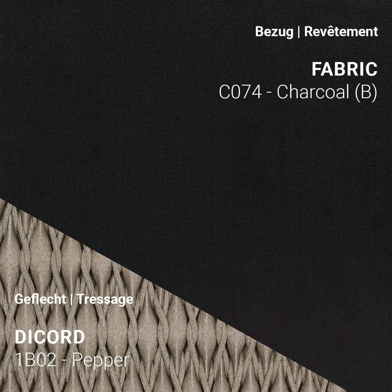 105 x 123 x H95 cm Seat height: 41 cm Armrest height: 33 cm Seat/backrest: Rope braid 4.5mm, recyclable, Green Guard certified Frame: teak Seat/backrest: Anthracite or Pepper Frame: Scuro UV-resistant All furniture in the series is available in 3 color combinations. The Manutti furniture is ordered specifically according to your color preferences and can be combined with 53 different cushion colors. We would be happy to send you samples upon request. However, no exchange is possible for individual orders.