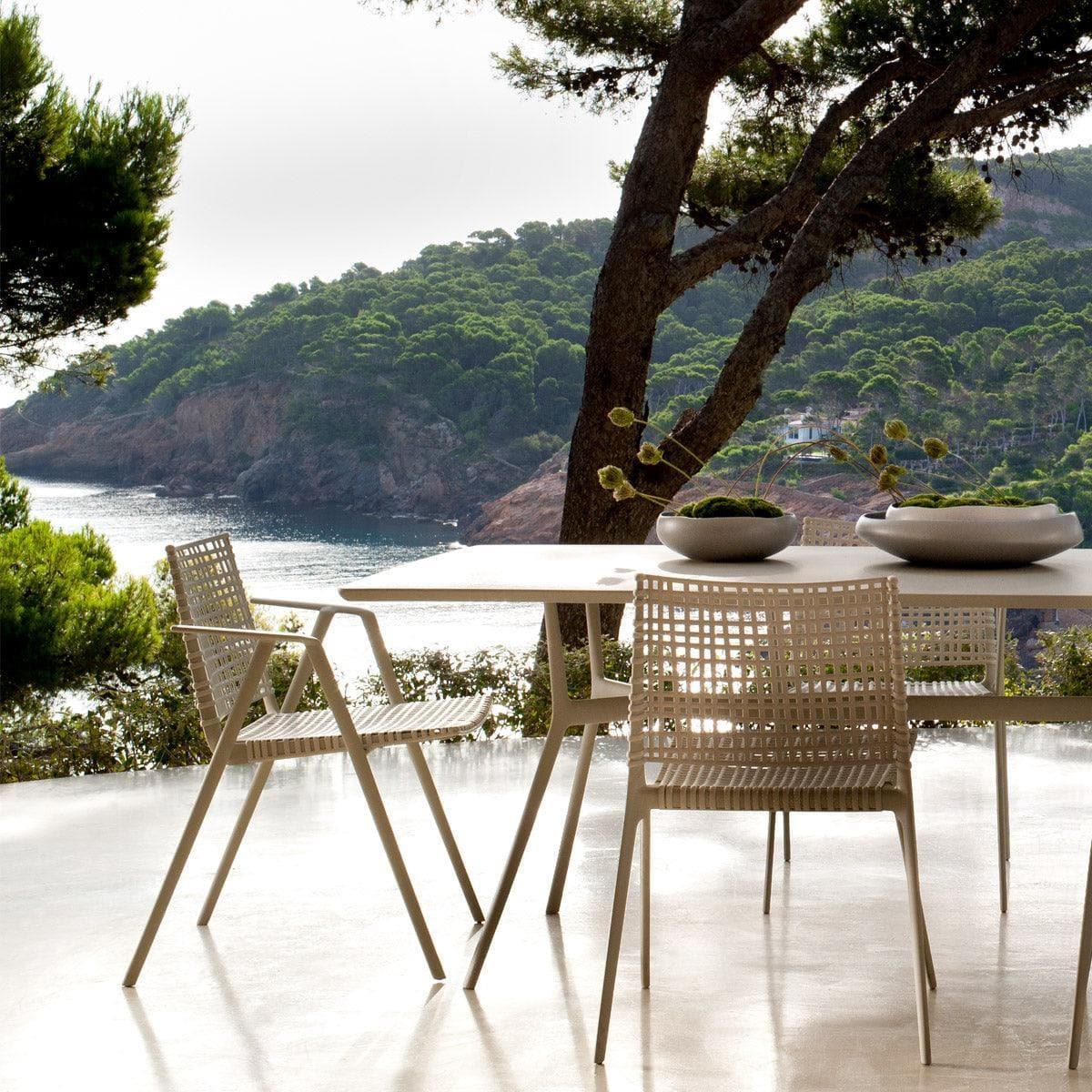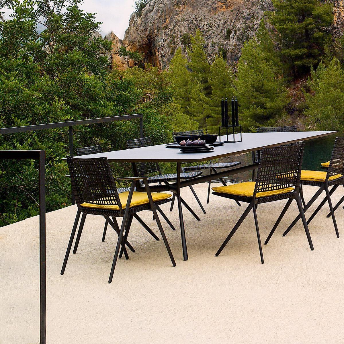 Tous les meubles de la collection sont extrêmement faciles d'entretien grâce à leur structure en aluminium laqué, leur dossier et leur assise en tissu Batyline®, et conviennent également aux climats salins rigoureux comme en bord de mer ou en bord de piscine.