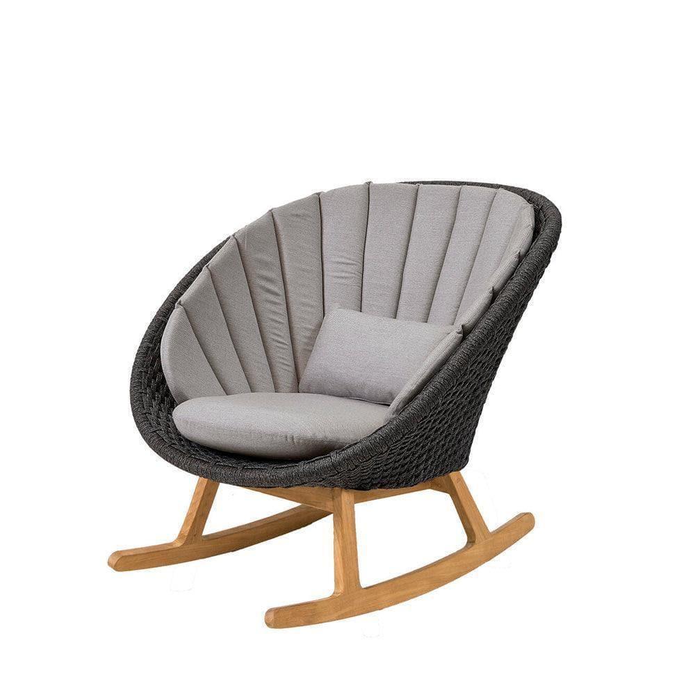 L'excellent confort d'assise du fauteuil à bascule Peacock est assuré par sa coque d'assise en "Soft Rope" velouté, qui supporte un coussin d'assise de qualité supérieure - au choix en tissu Natté ou Focus résistant aux intempéries.