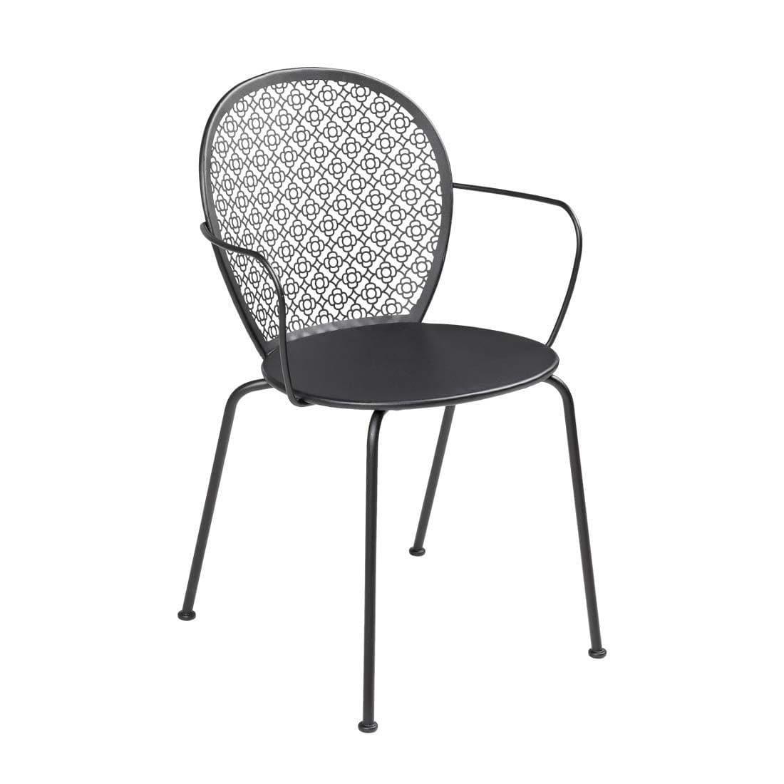 58x42xH84cm Hauteur d'assise : 45cm Hauteur avant accoudoir : 66cm Châssis : tube d'acier Assise : tôle d'acier Accoudoirs : tube d'acier Dossier : Tôle d'acier perforée découpée au laser - usage privé - Usage professionnel/Horeca - pas pour un usage public