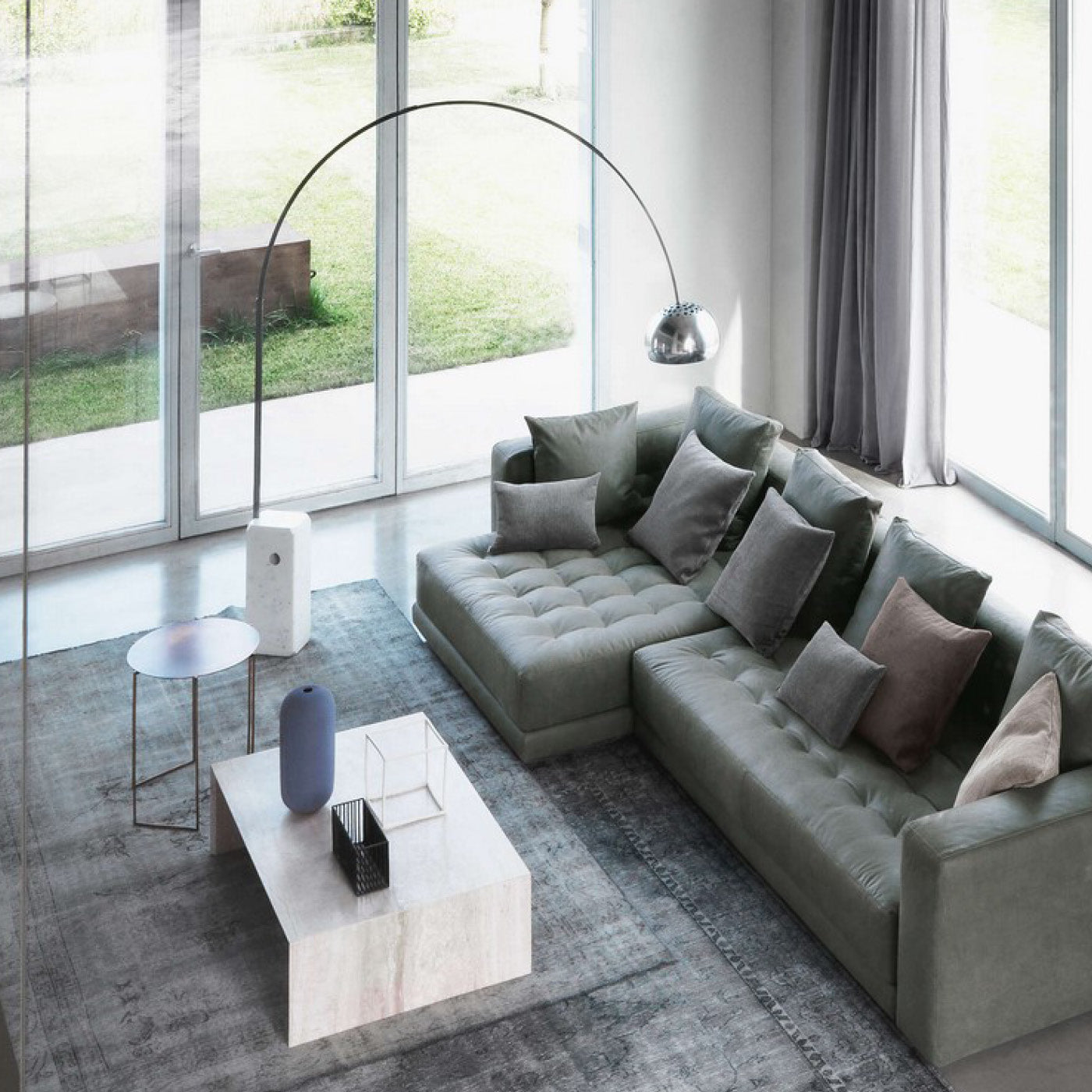 Flos-Stehlampe in modernem Wohnzimmer mit Ecksofa.