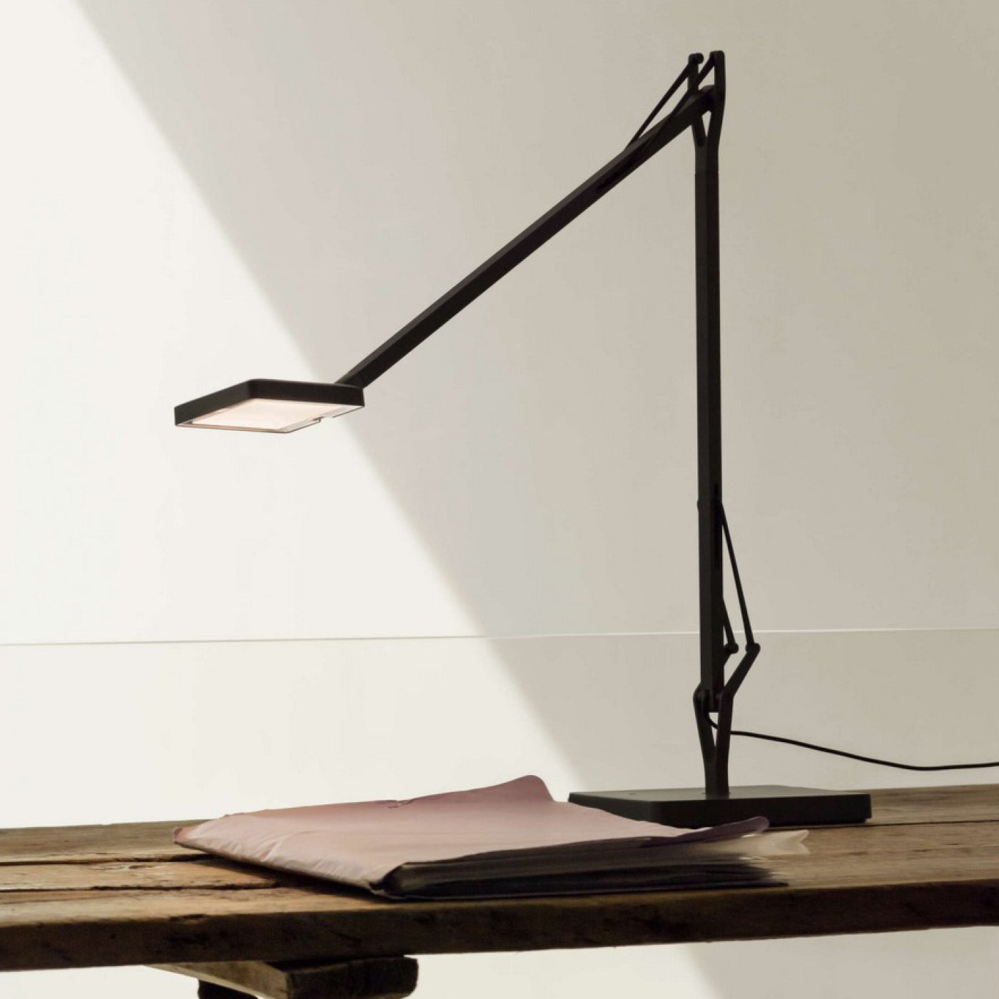 Flos-Schreibtischlampe auf rustikalem Holztisch.