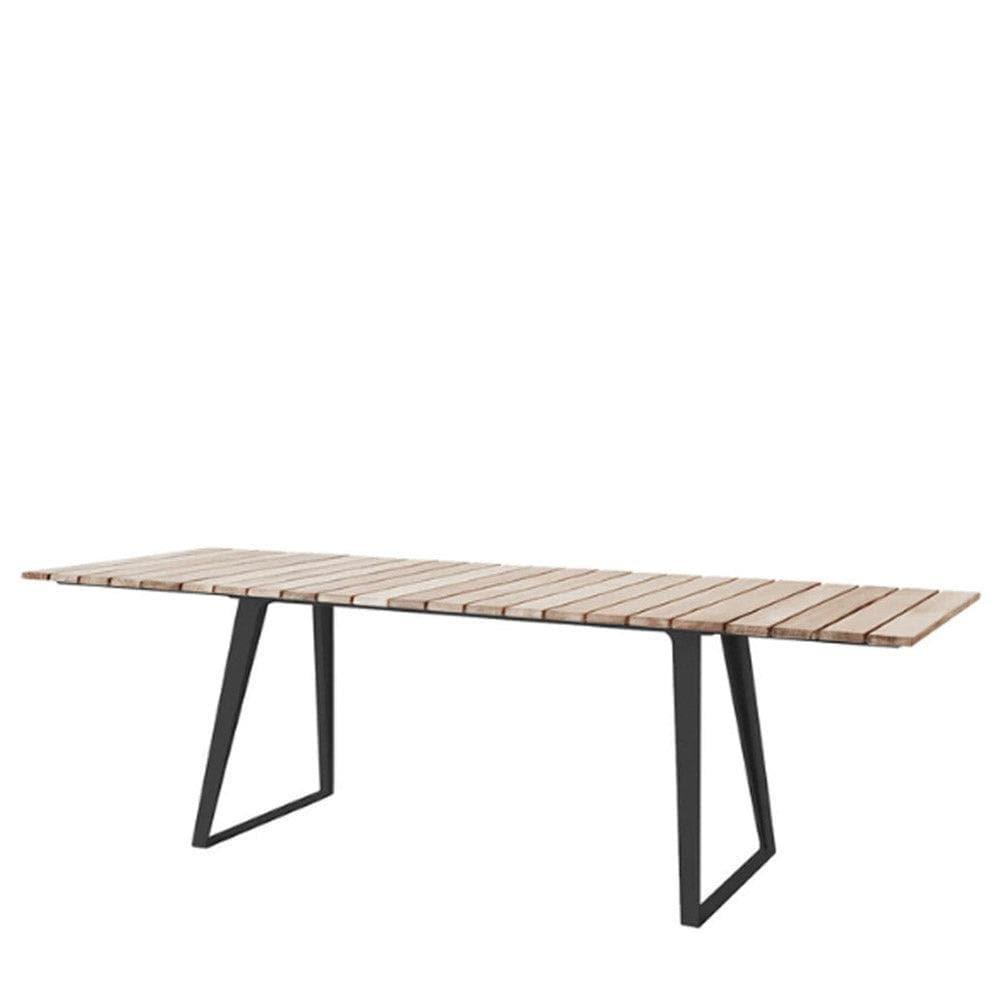 Avec ses deux grands plateaux encastrés, la table se fait cependant étroite sur sa largeur – d’à peine 84 cm – afin de s’adapter même aux terrasses les plus petites. Le bois teck est certifié SVLK, afin de la rendre durable dans tous les sens du terme !