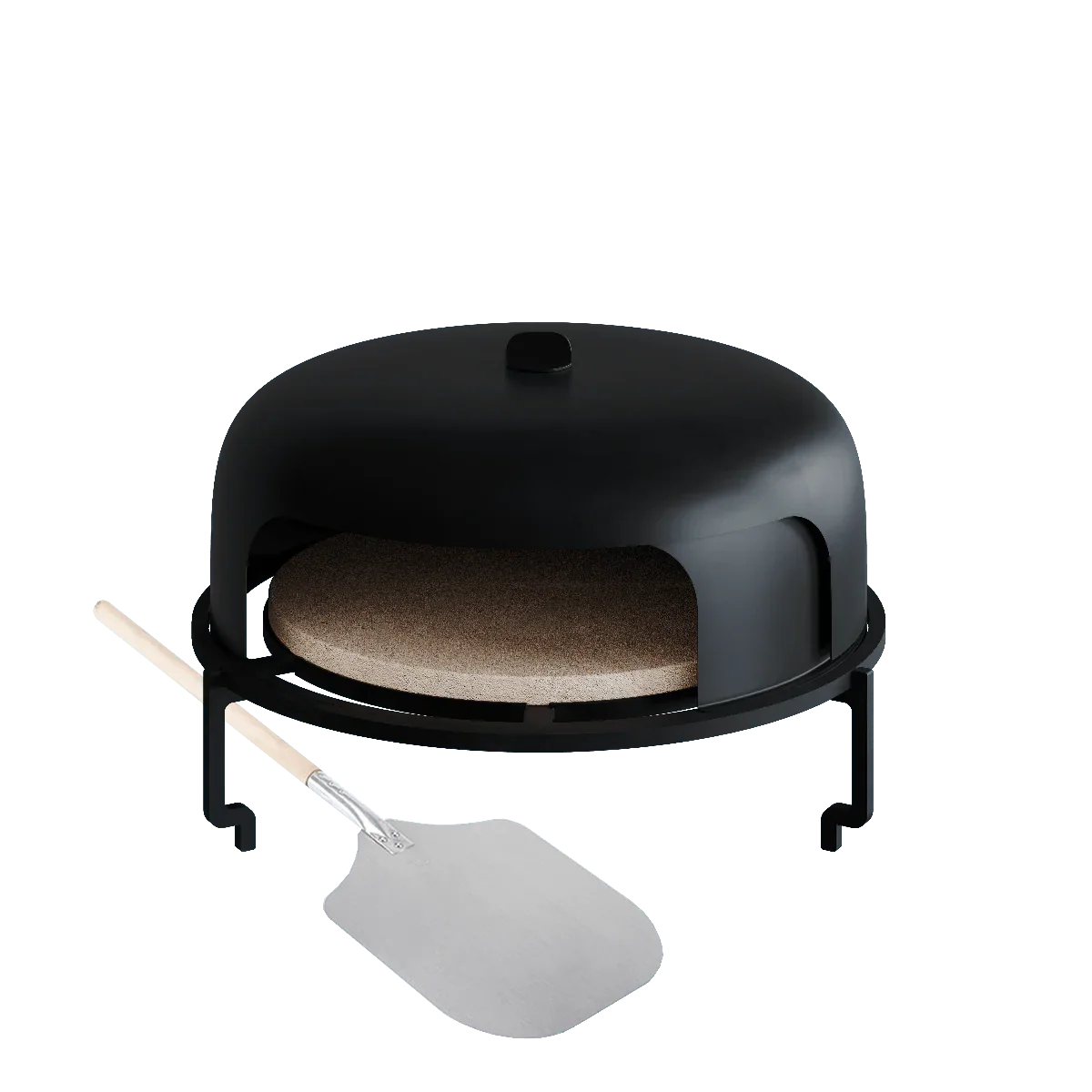 S'il y a un appareil de cuisson en plein air qui est super populaire de nos jours, c'est bien le fameux four à pizza ! Avec son feu de bois qui crépite, votre OFYR se prête particulièrement bien à la préparation de délicieuses pizzas. Il n'a donc pas fallu grand-chose pour inspirer ce petit four amovible qui vous permet de passer en un clin d'œil des brochettes de viande aux "4 saisons" faites maison ! Le four à pizza OFYR se compose d'une plaque en fonte lisse qui accueille les pizzas d'un côté et est nervurée de l'autre pour servir de grill, d'une pierre à pizza à poser et d'une double cloche en acier pour une cuisson uniforme. Un bouton rotatif sur la plaque de cuisson vous permet de régler facilement la taille de l'ouverture entre la cloche intérieure et la cloche extérieure et de contrôler ainsi la circulation de l'air et donc la température de cuisson. Utilisez toujours des gants de four lorsque vous manipulez le bouton rotatif, car il peut devenir extrêmement chaud.