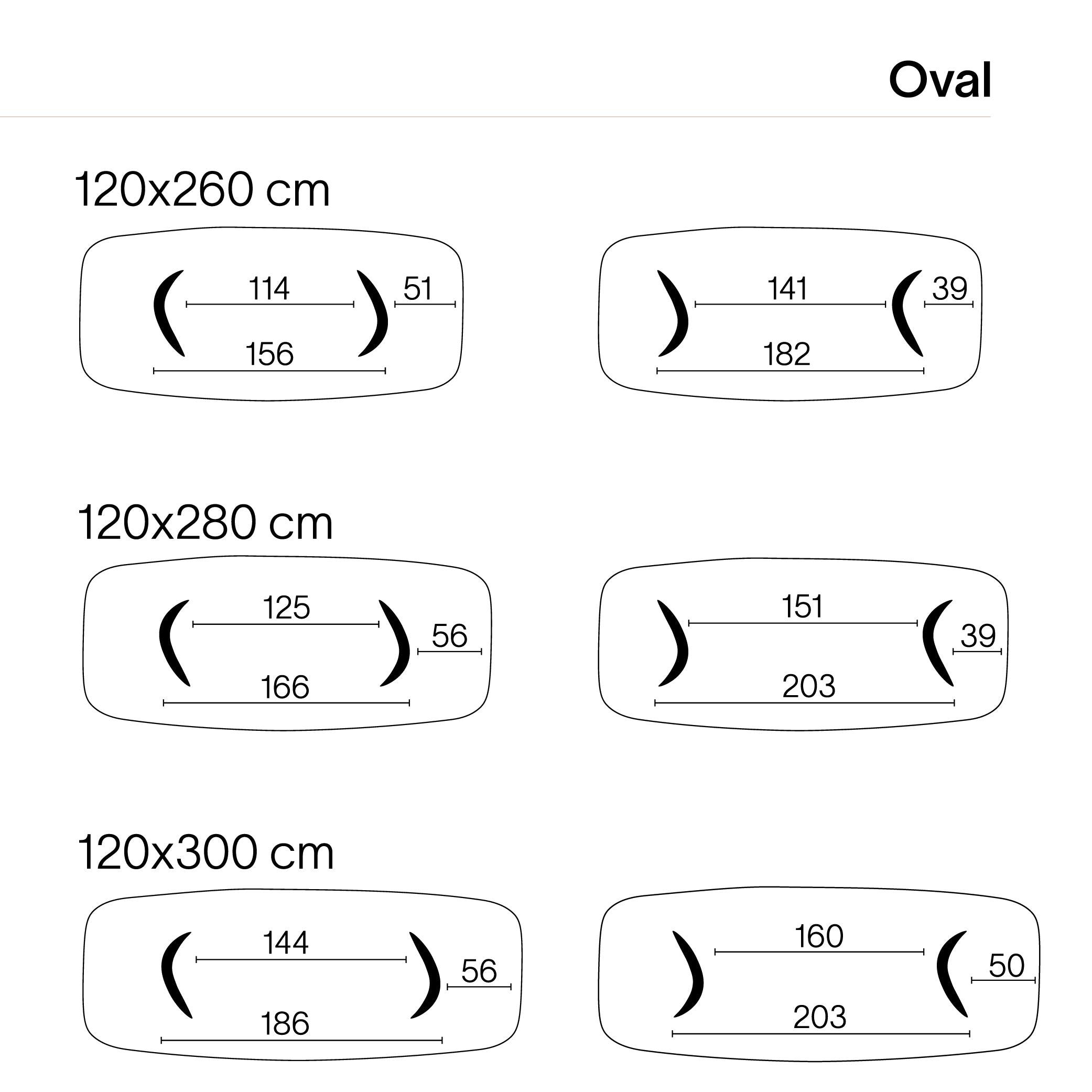 100x200cm 100x220cm 100x240cm 120x260cm 120x280cm 120x300cm Hauteur: 76cmTaille Poids 101kg - 140kg Matériau Plateau : plateau de base en multiplex de 31mm (ovale), avec chant suisse noir, recouvert d'un placage en bois véritable de 0.6mm avec "motif de points hongrois". Garantie 2 ans de garantie du fabricant