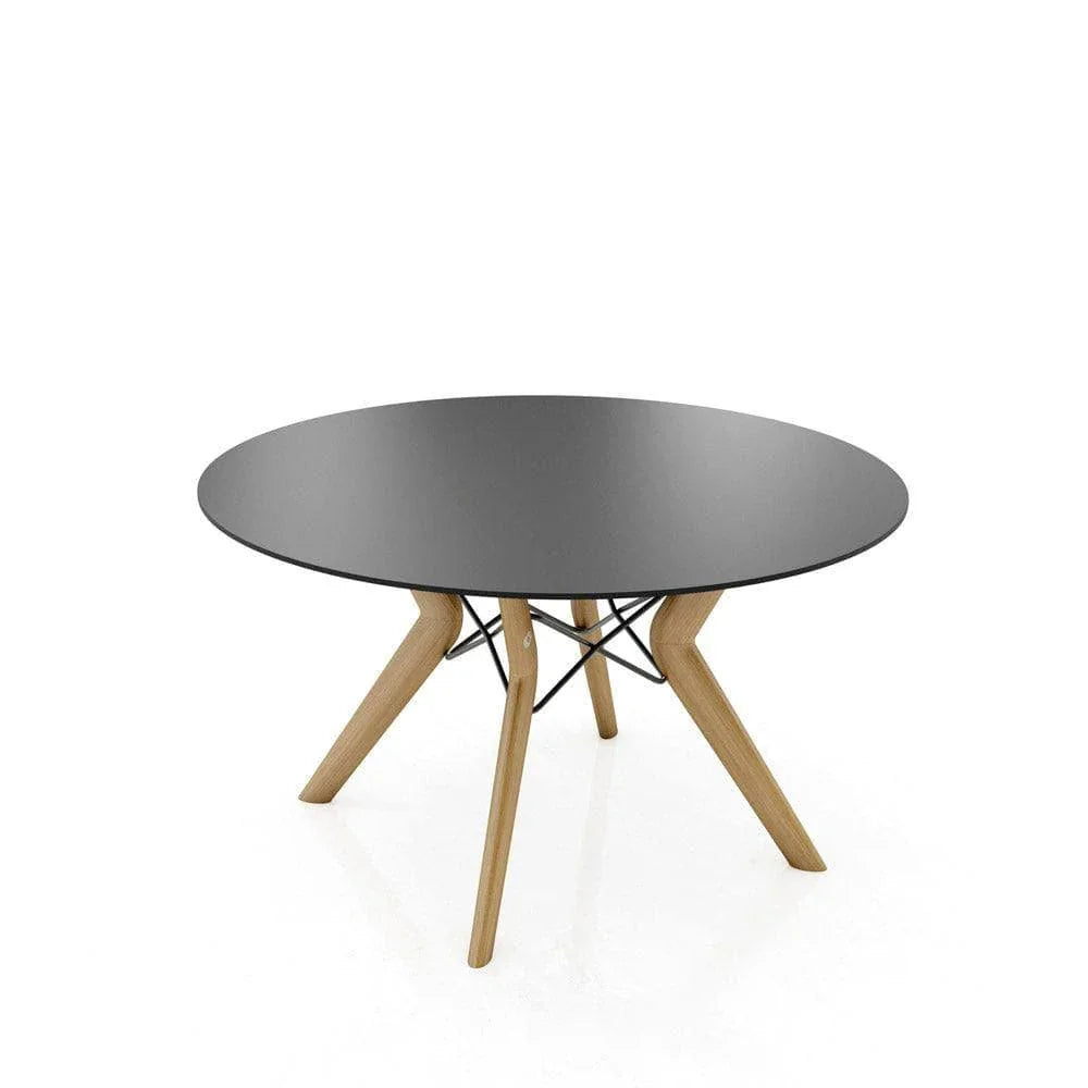 Cette table Tribu est disponible en 135 cm ou 160 cm de diamètre et dispose d'un piètement renforcé par une série de tiges métalliques dont les couleurs sont personnalisables.