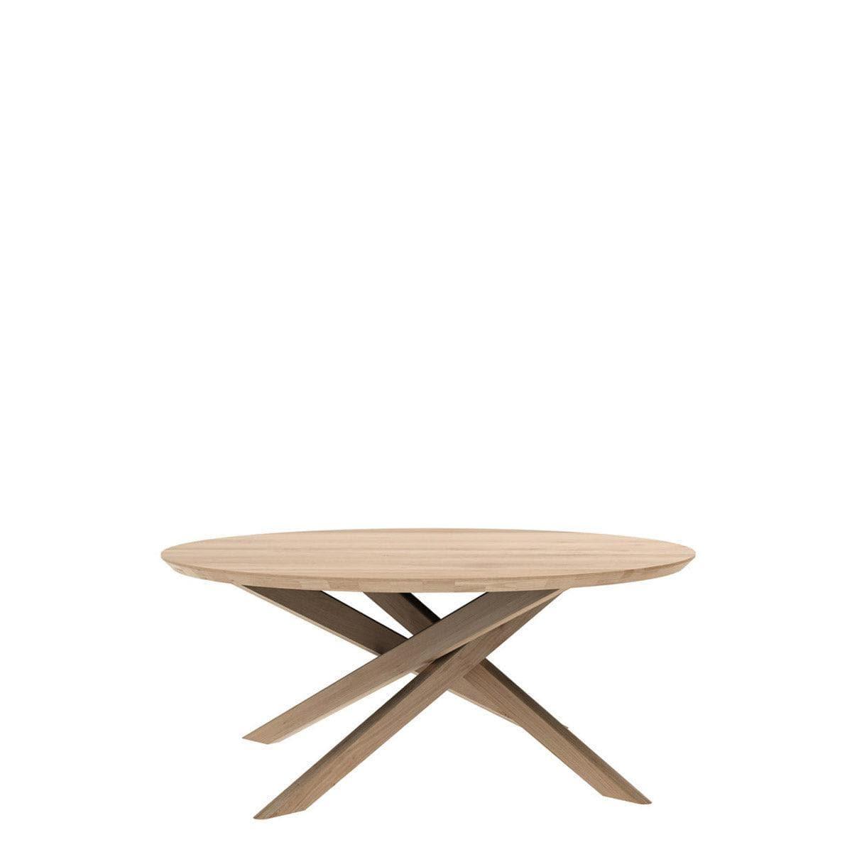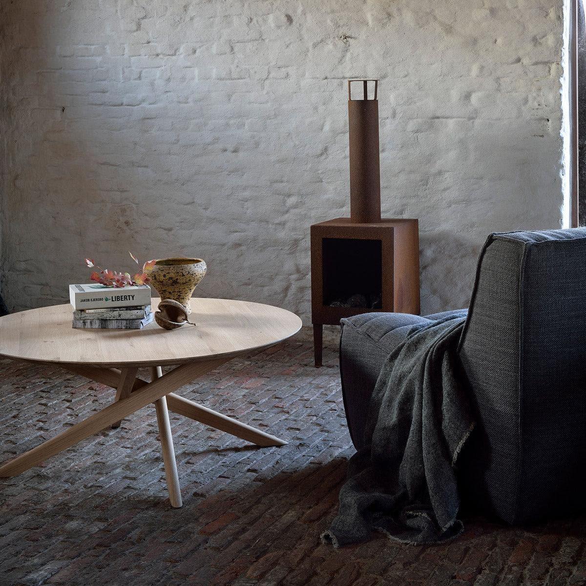 La table basse ronde MIKADO convainc par son design bien pensé, qui reprend l'essence du jeu classique du mikado et le traduit en un meuble. Les lignes diagonales et les proportions parfaites des poutres en bois créent un lien harmonieux entre stabilité et élégance. La surface lisse de la table forme un contraste fascinant avec les solides poutres en chêne qui lui confèrent son look caractéristique et moderne.