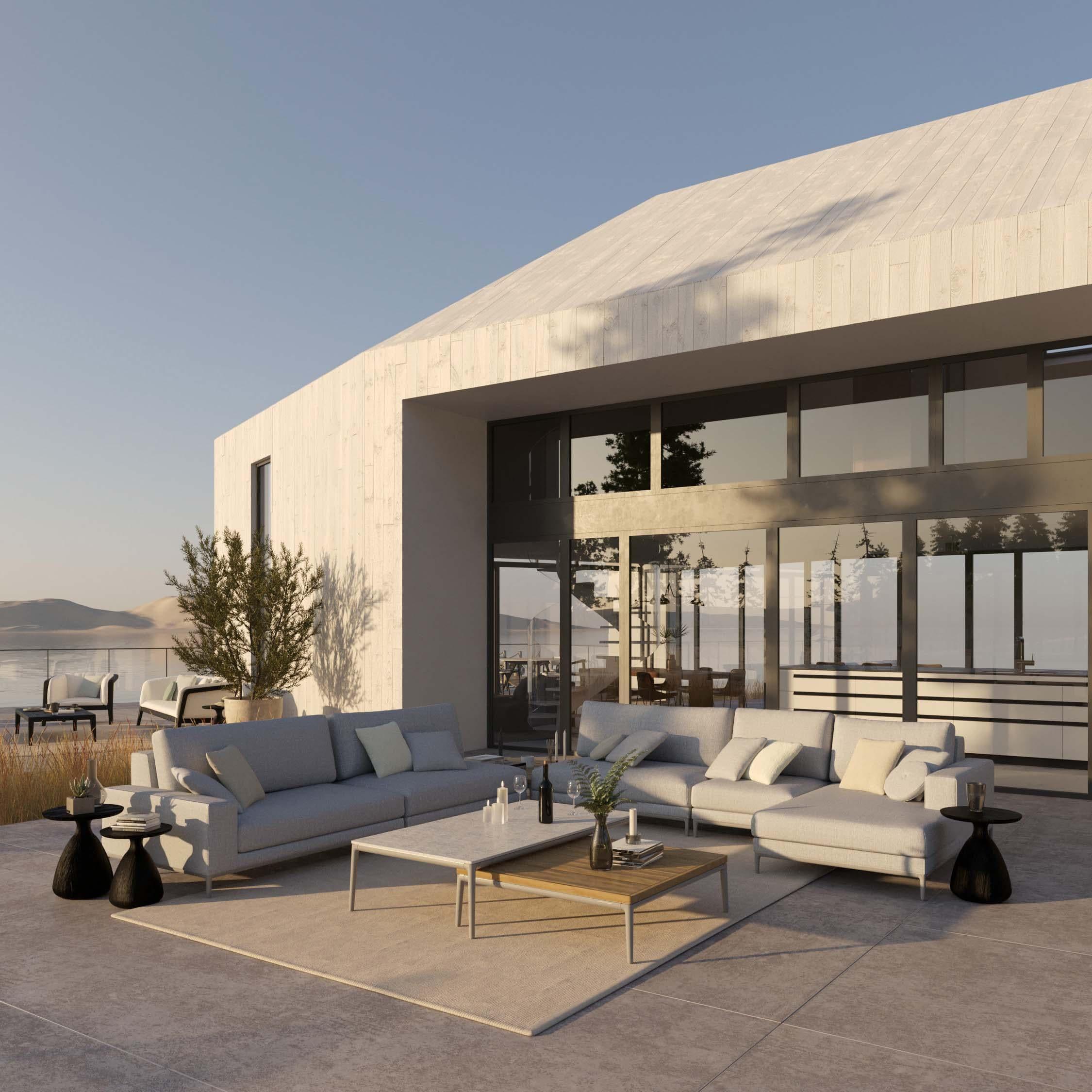 Cadre : aluminium thermolaqué Plateau de table : teck ou céramique Monture : silex Plateau de table : teck naturel | Teck "Scuro" (foncé) | Fossile, Perle | Travertin Géo | Béton