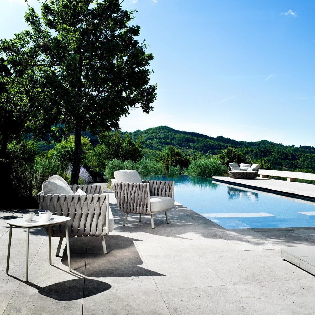 Tous les meubles de la collection Tosca sont extrêmement faciles à entretenir grâce à leur structure en acier inoxydable, leur dossier en Tricord® tissé et leur assise en Sunbrella, et conviennent également à une utilisation dans des climats salins rigoureux, comme au bord de la mer ou au bord de la mer. piscine.
