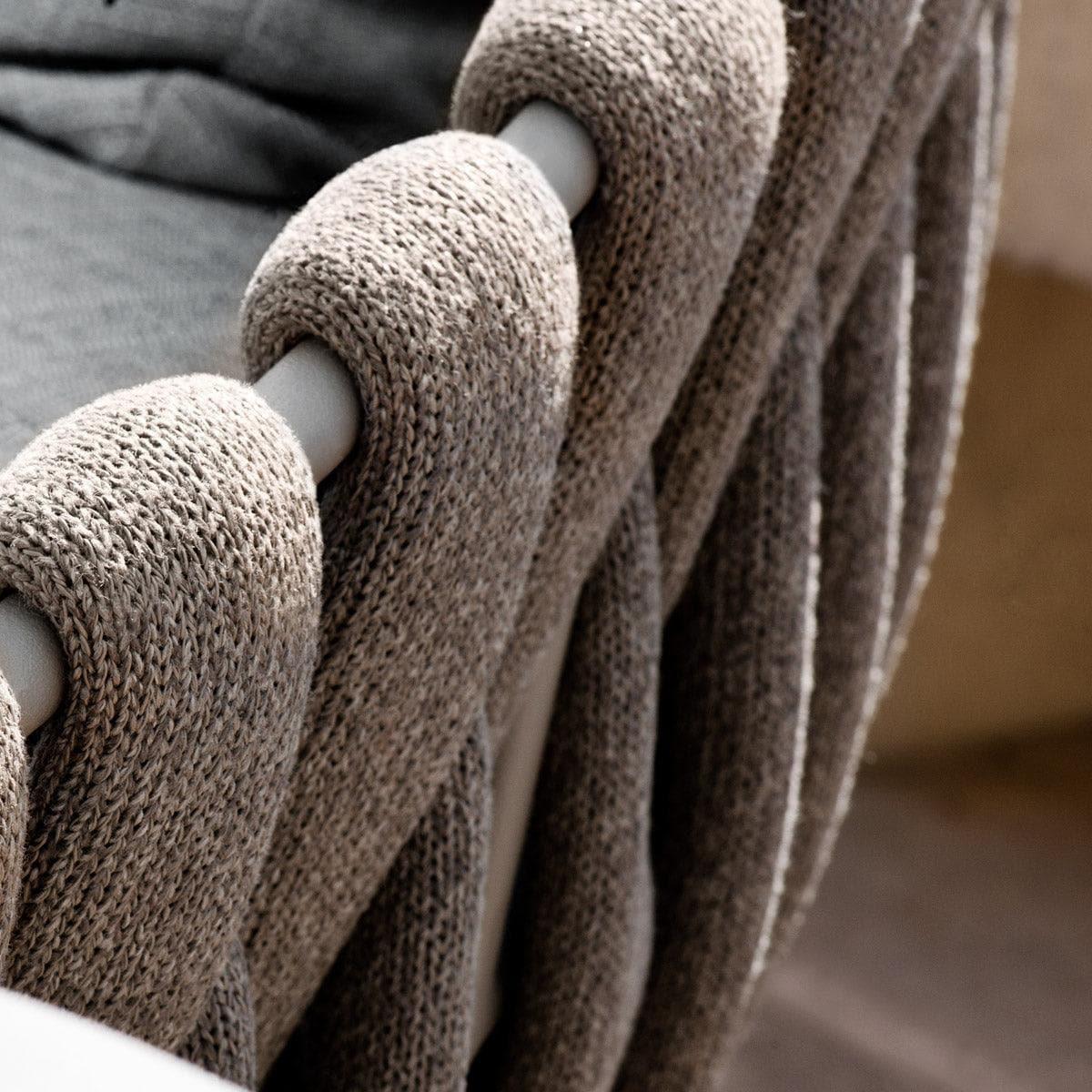 L’assise arrondie, composée d’un large tressage vertical, est portée par des jambes délicates qui lui confèrent une allure pleine de grâce. Grâce à son tressage exclusif en caoutchouc mousse habillé d’un revêtement en Textilène et en Tricord tricoté, l’assise est douce et souple, parfaitement résistante à la vie en plein air et pleine de charme naturel.