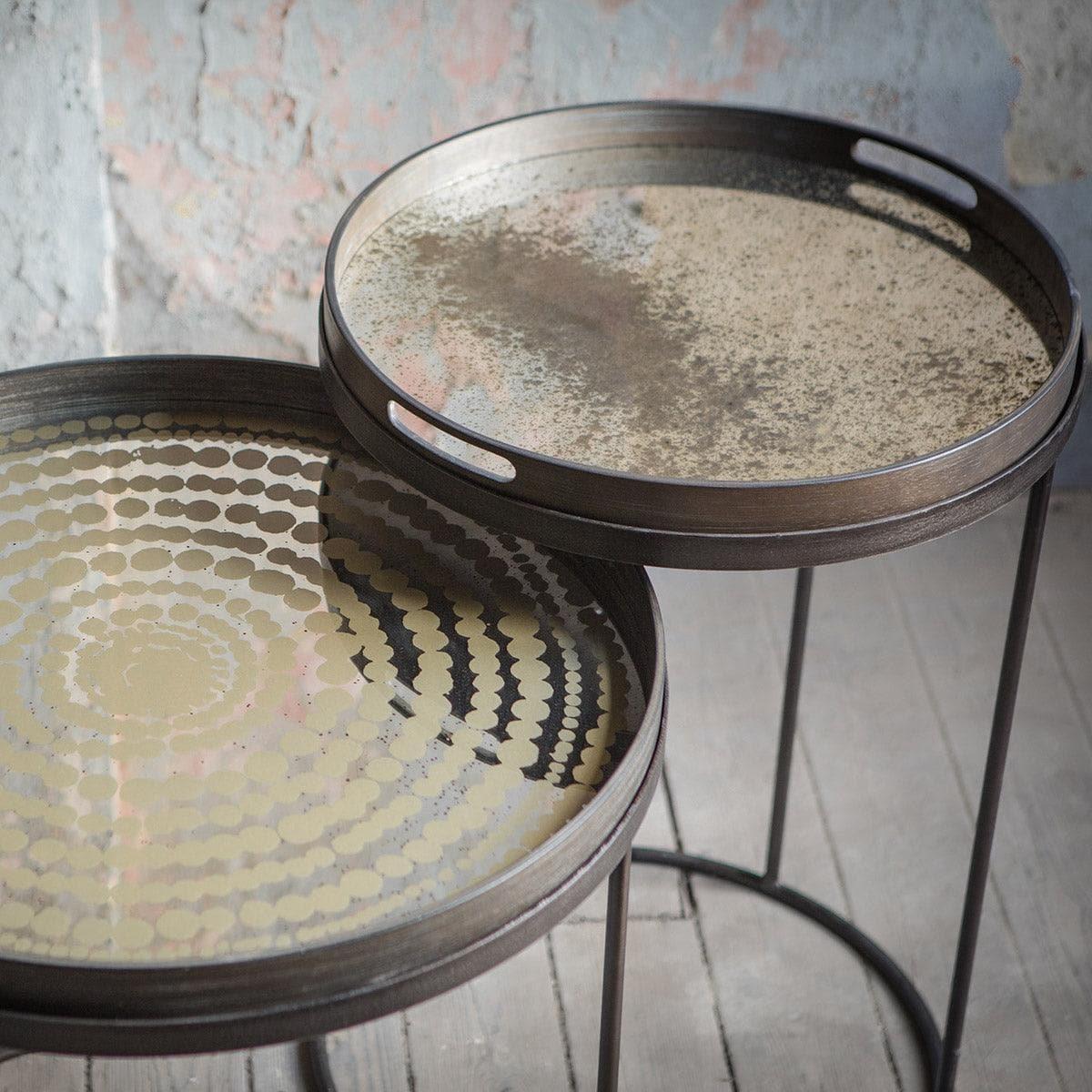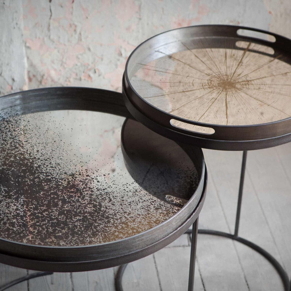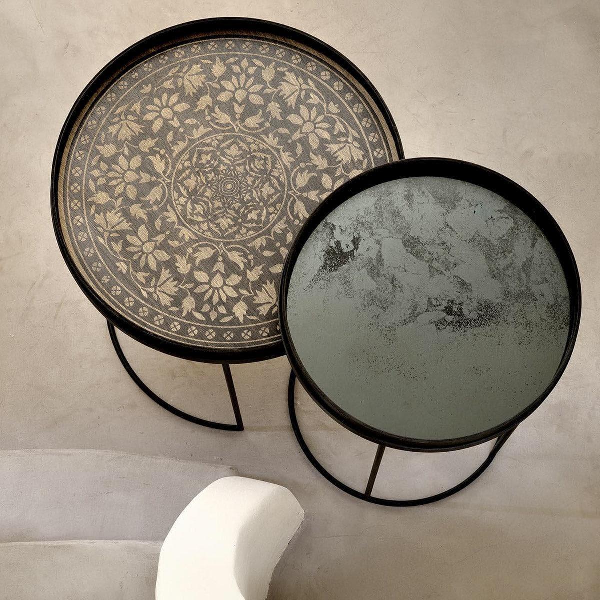 Das Tablett wird aus einem dunklen Spiegelglas gefertigt, das durch einen speziellen Alterungsprozess seinen einzigartigen, verwitterten Look erhält. Das Holz ist mit einem Lack auf Wasserbasis behandelt, was nicht nur für eine langlebige Schutzschicht sorgt, sondern auch die natürliche Schönheit des Materials bewahrt.