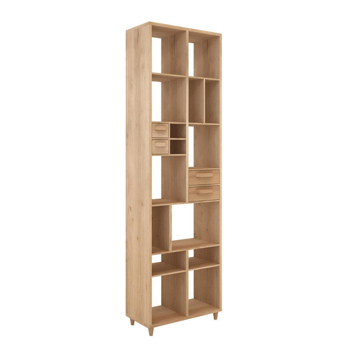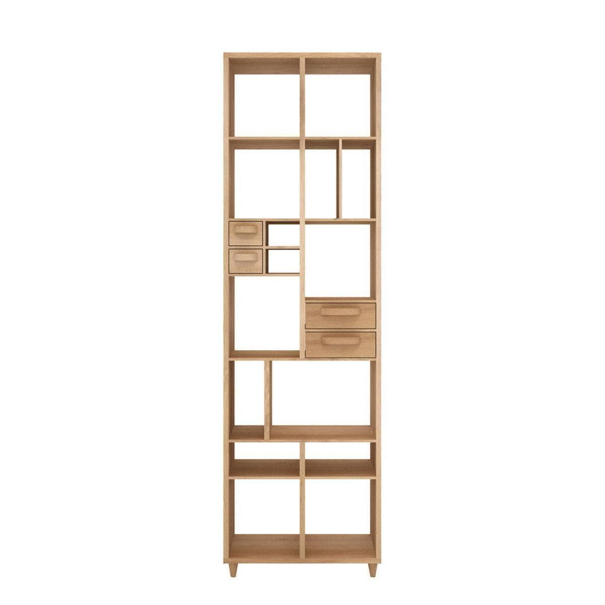 Gefertigt aus massiver Eiche, die aus nachhaltig bewirtschafteten französischen Wäldern stammt, überzeugt das Bücherregal durch seine robuste Bauweise und natürliche Schönheit. Die warme Holzfarbe und die feine Maserung verleihen Ihrem Wohnbereich eine einladende und zugleich elegante Atmosphäre. Besonders die vier integrierten Schubladen bieten zusätzlichen Stauraum für kleine Gegenstände und tragen zum harmonischen Erscheinungsbild bei.