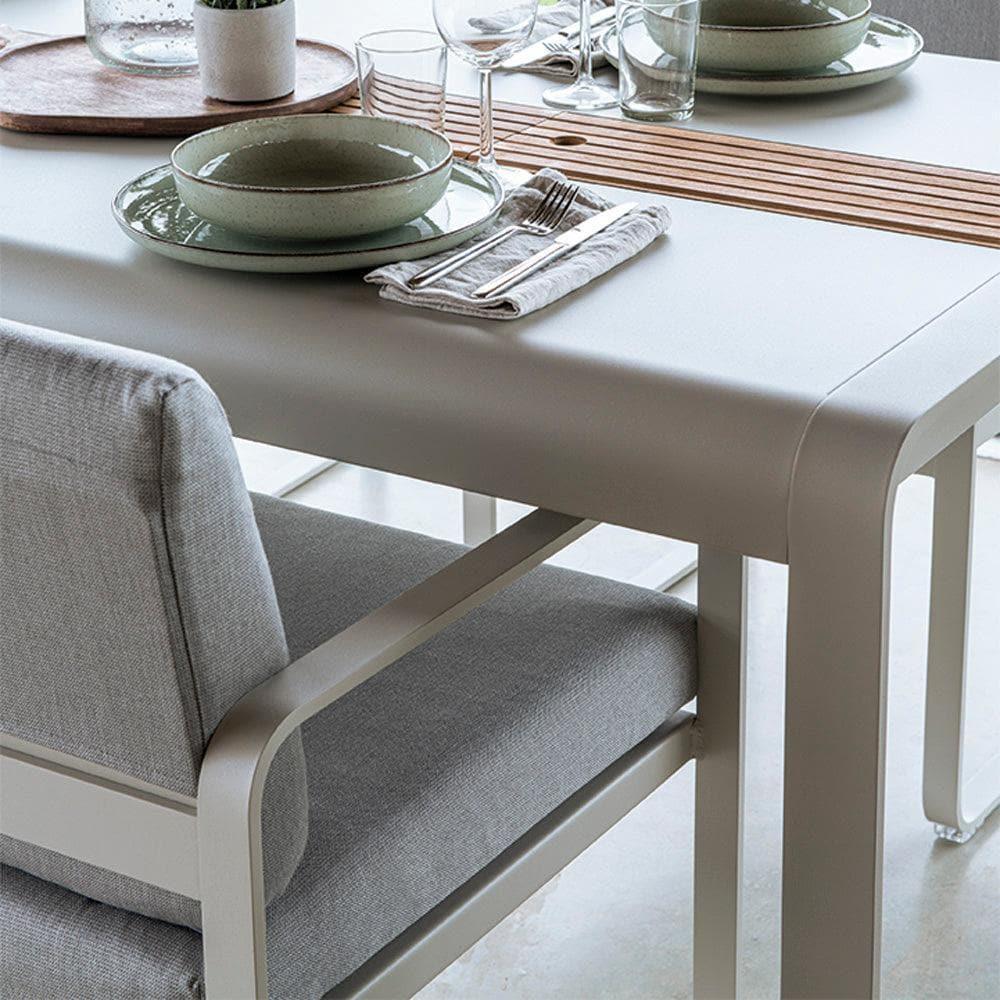 Die einzigartige Kombination aus Aluminium und Teakholz verleiht dem Tisch eine bemerkenswerte Stabilität und Leichtigkeit. Die Teak-Einlagen fungieren als stilvolle Abdeckung der Ablagefläche und können auch als dekorative Tischläufer genutzt werden. So setzen Sie Windlichter oder Blumen perfekt in Szene und schaffen eine einladende Atmosphäre, die jedes Gartenfest bereichert.