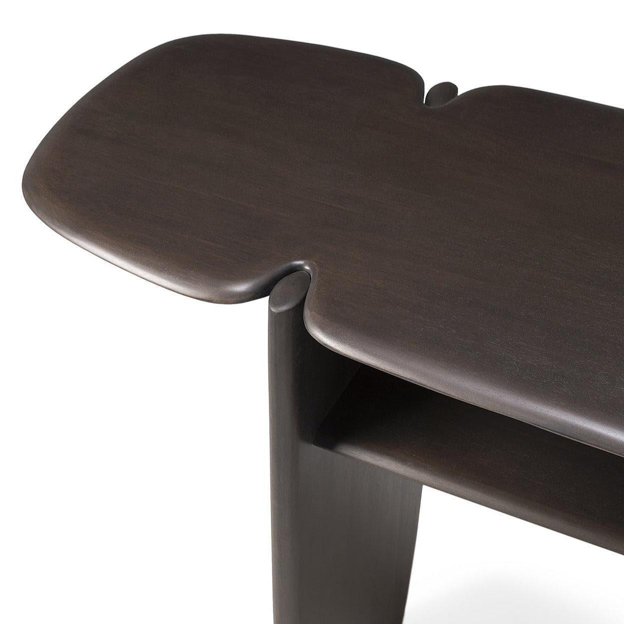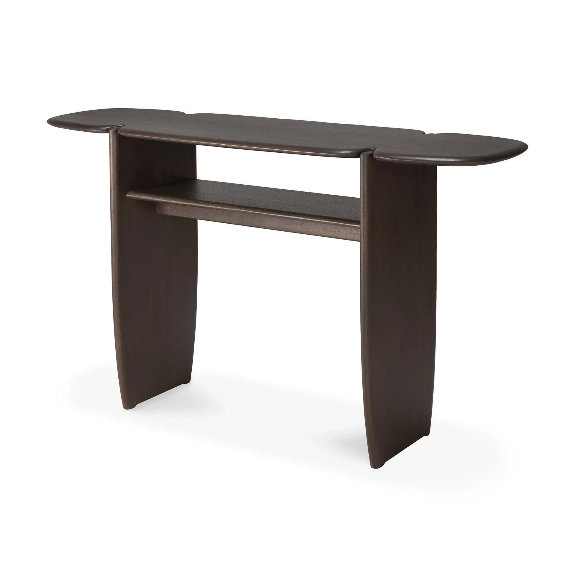 Das Design der Konsole PI besticht durch seine elegante Schlichtheit und die subtile Kombination aus Funktionalität und Ästhetik. Die polierte Oberfläche betont die natürlichen Maserungen und Farben des Holzes, während die unregelmäßigen Formen jedem Raum eine besondere Note verleihen. Diese Konsole eignet sich ideal für verschiedene Wohnstile, sei es als stilvolles Highlight im Eingangsbereich oder als praktischer Begleiter im Wohnzimmer.