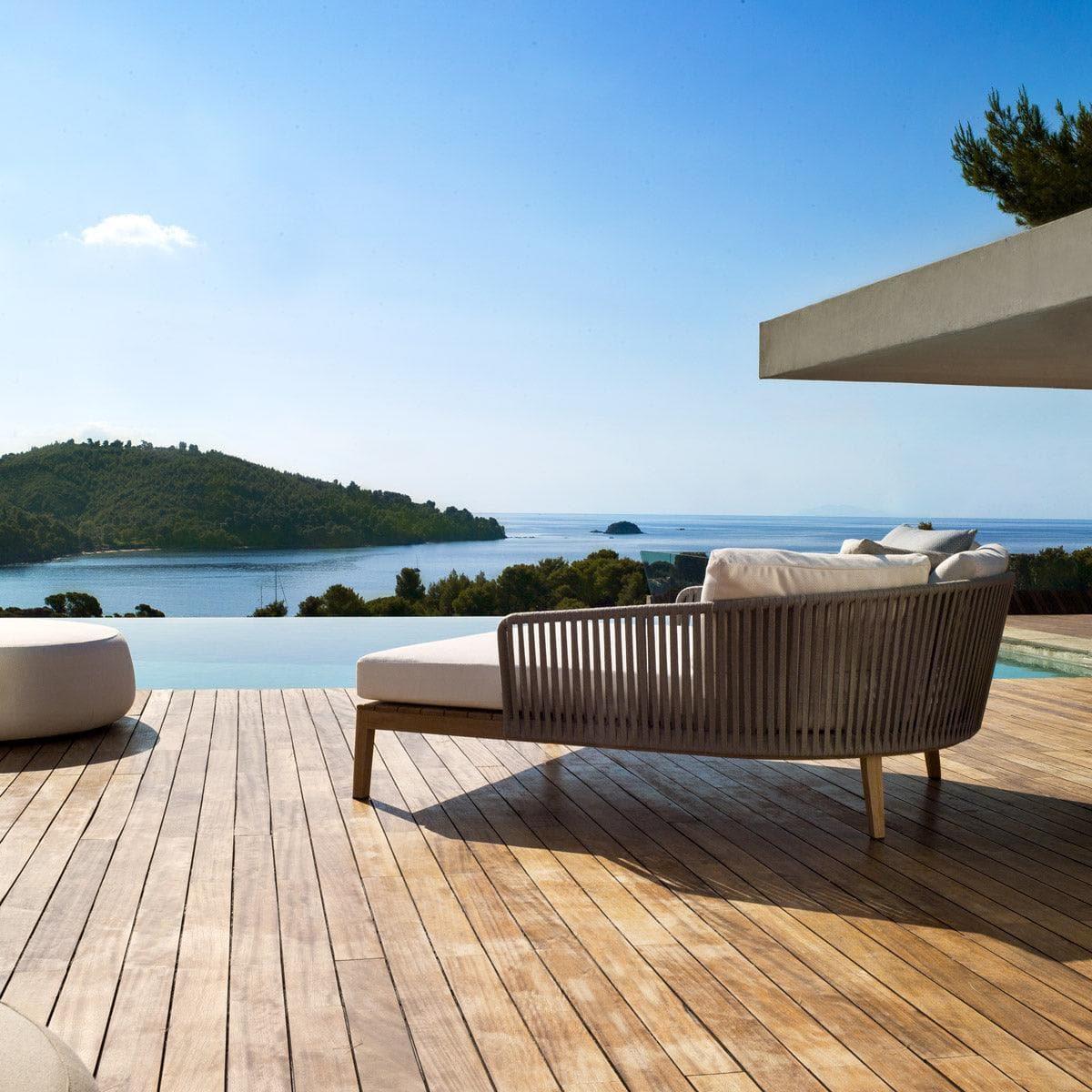 Die Sitzfläche des Sonnenbetts besticht durch ihre sanft abgerundeten Ecken, die dem Möbelstück eine einladende und zugleich elegante Optik verleihen. Das verwendete Tricord-Gewebe, eine Mischung aus Polyolefin und Polyester, bietet eine weiche Haptik und ist gleichzeitig absolut wetterfest, wodurch es sich ideal für den ganzjährigen Einsatz im Freien eignet. Tribù bietet das Geflecht der Rückenlehne in fünf natürlichen Farben an, darunter Erdbraun, Linen, Moosgrün, Steingrau und Wengé, um sich nahtlos jedem Außenbereich anzupassen.