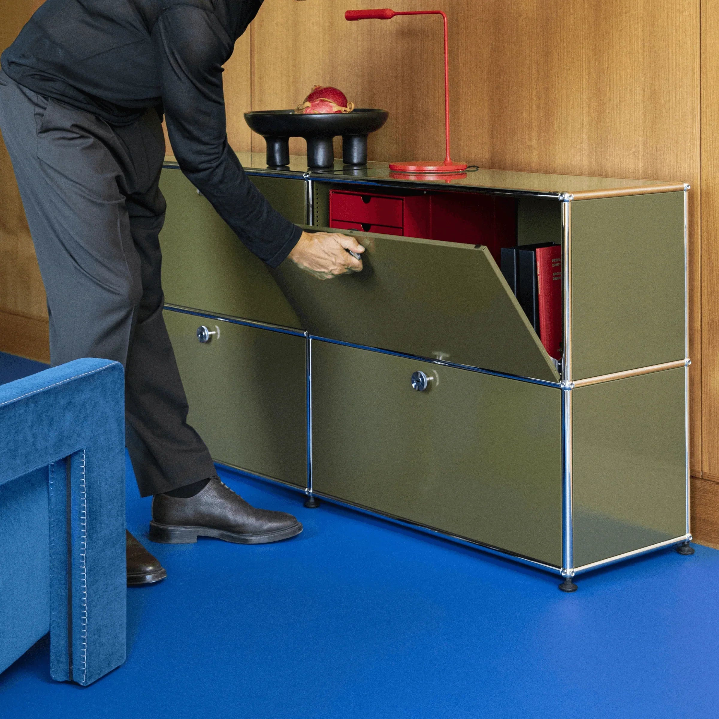 Das USM Haller Sideboard C2 ist ein wahrer Designklassiker, der sich perfekt in Ihren Wohnbereich oder Flur einfügt. Mit seiner eleganten Präsenz bietet das Sideboard nicht nur funktionalen Stauraum, sondern auch eine stilvolle Ablagefläche. Die zwei Klapptüren verbergen einen großzügigen Innenraum, der Ihre persönlichen Gegenstände diskret und ordentlich aufbewahrt.