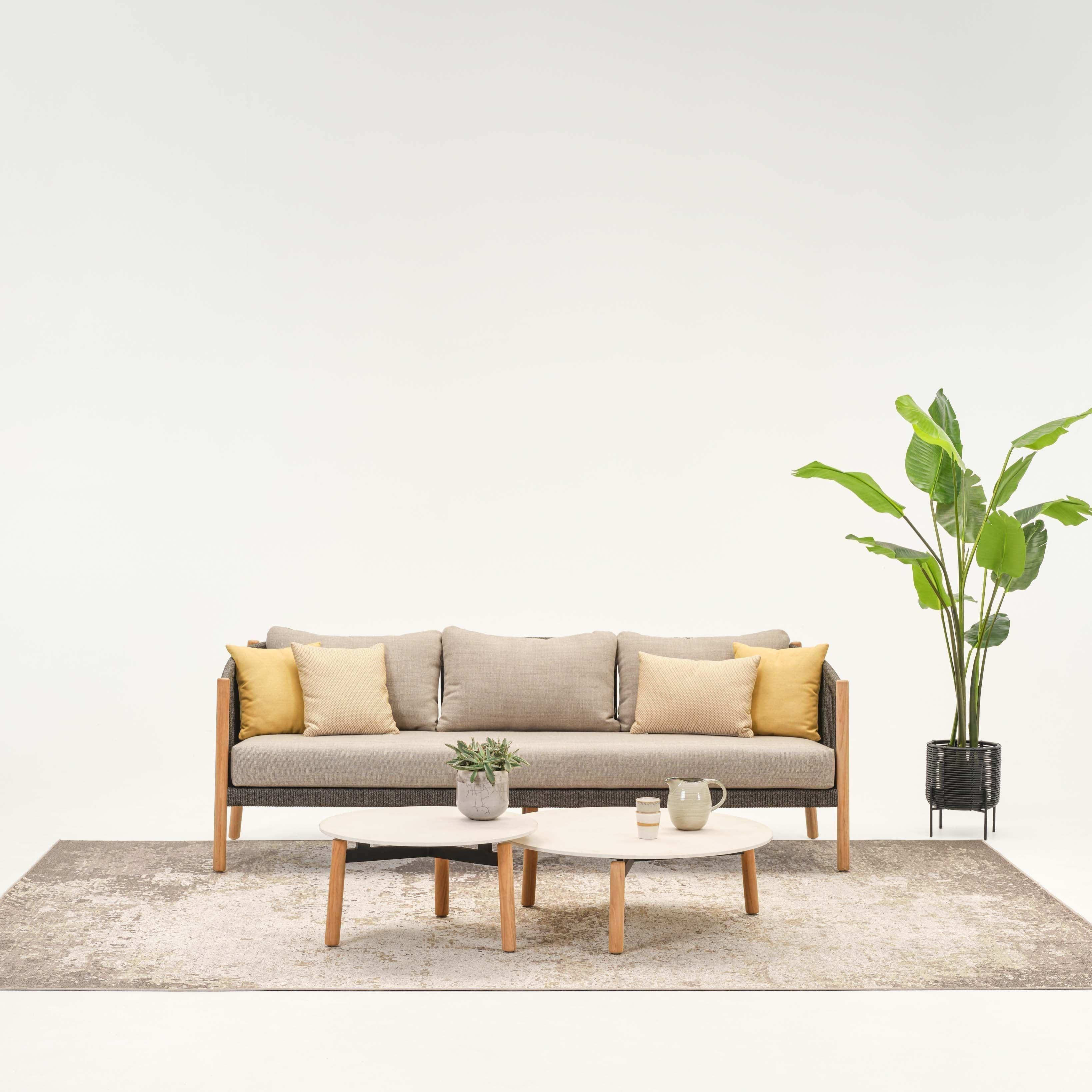 Entdecken Sie das Gartensofa LENTO von Vincent Sheppard, ein Meisterwerk der Handwerkskunst und des Designs, das Ihrem Außenbereich einen Hauch von Eleganz verleiht. Dieses stilvolle 3-Sitzer-Sofa vereint Funktionalität und Ästhetik auf höchstem Niveau. Die massiven Beine aus edlem Teakholz bieten nicht nur Stabilität, sondern auch eine natürliche Schönheit, die sich harmonisch in jede Gartenlandschaft einfügt. Die hochgezogene Rückenlehne aus geflochtenem Seil verleiht dem Sofa einen einzigartigen Charakter und lädt zum Verweilen ein.