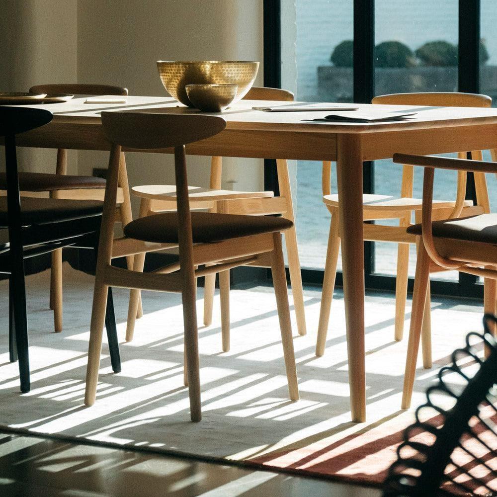 Die klaren Linien und die exquisite Verarbeitung des Holzes verleihen dem Stuhl eine zeitlose Eleganz. Erhältlich in zwei edlen Varianten – massiver Eiche in Natural Oak oder Buche in Nearly Black – passt sich der Stuhl mühelos verschiedenen Einrichtungsstilen an. Die massiven Holzrahmen sorgen für Stabilität und Langlebigkeit, während die sorgfältige Polsterung höchsten Sitzkomfort garantiert.